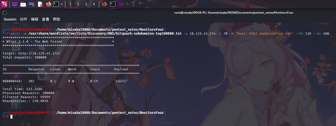 wfuzz -w /usr/share/wordlists/seclists/Discovery/DNS/bitquark-subdomains-top100000.txt -u 10.129.45.174 -t 70 -H "Host: FUZZ.monitorsfour.htb" --hh 138 --hc 400