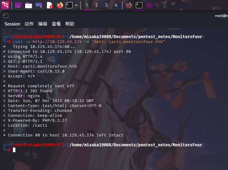 发现子域名为cacti时,Web服务返回了302重定向包,但正文为空。尝试使用curl观察HTTP响应细节: