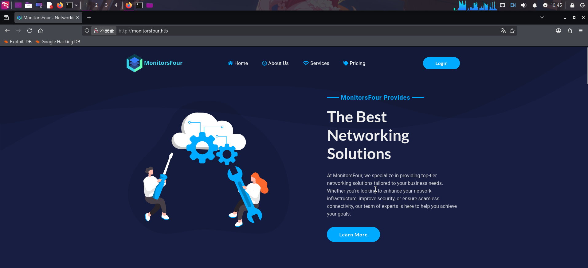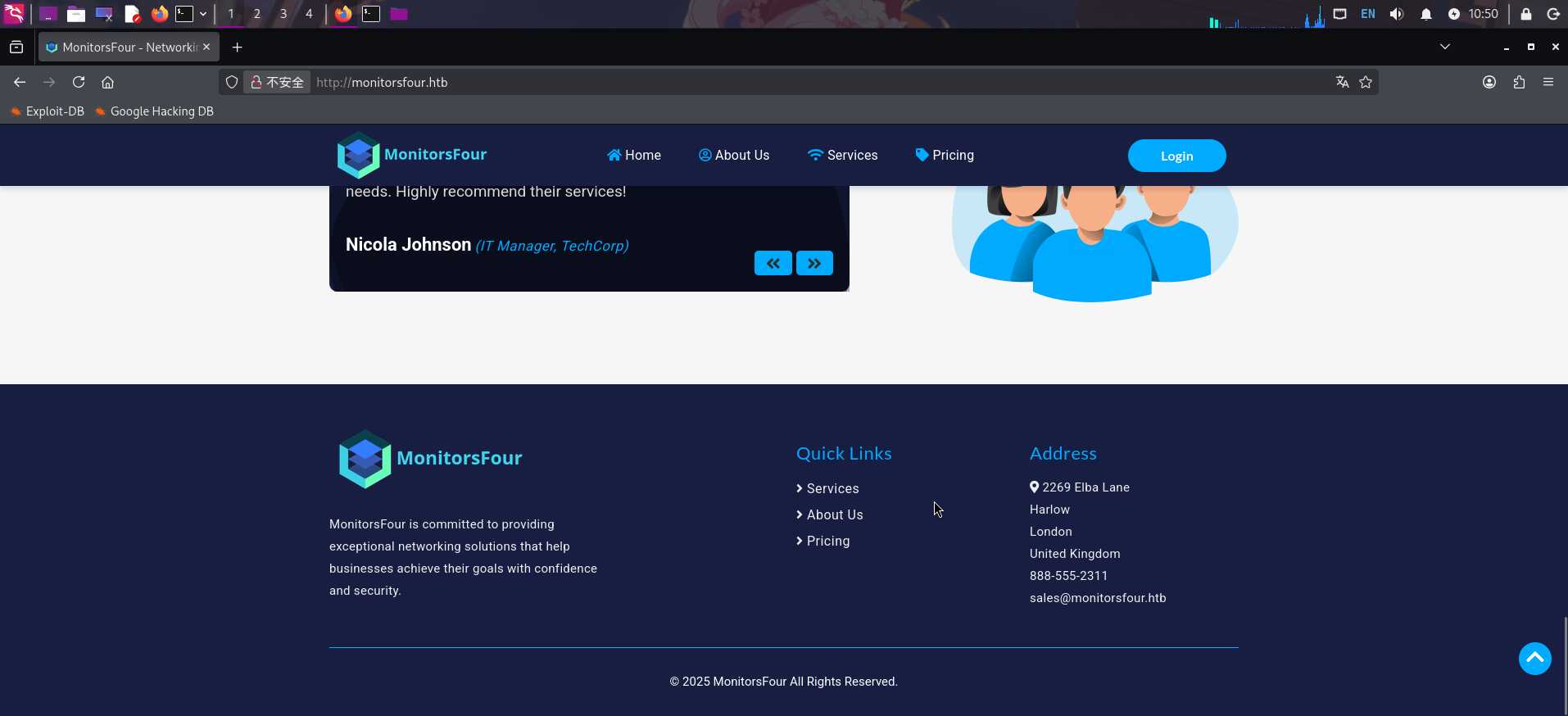 发现该站点为一家网络运维服务公司的业务网站。通读网页源代码,发现页面底部存在一个电子邮箱sales@monitorsfour.htb: