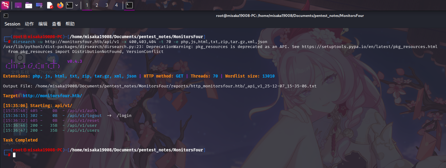 dirsearch -u http://monitorsfour.htb/api/v1 -x 400,403,404 -t 70 -e php,js,html,txt,zip,tar.gz,xml,json