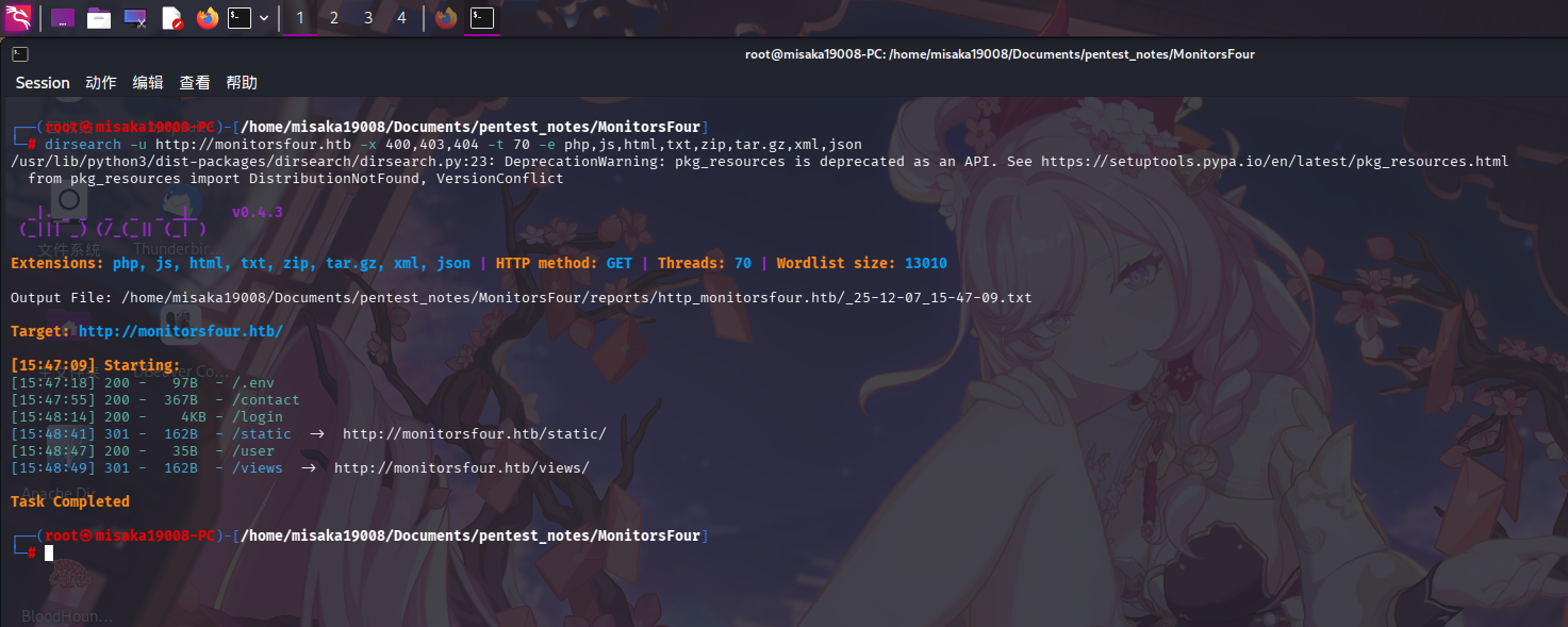 dirsearch -u http://monitorsfour.htb -x 400,403,404 -t 70 -e php,js,html,txt,zip,tar.gz,xml,json