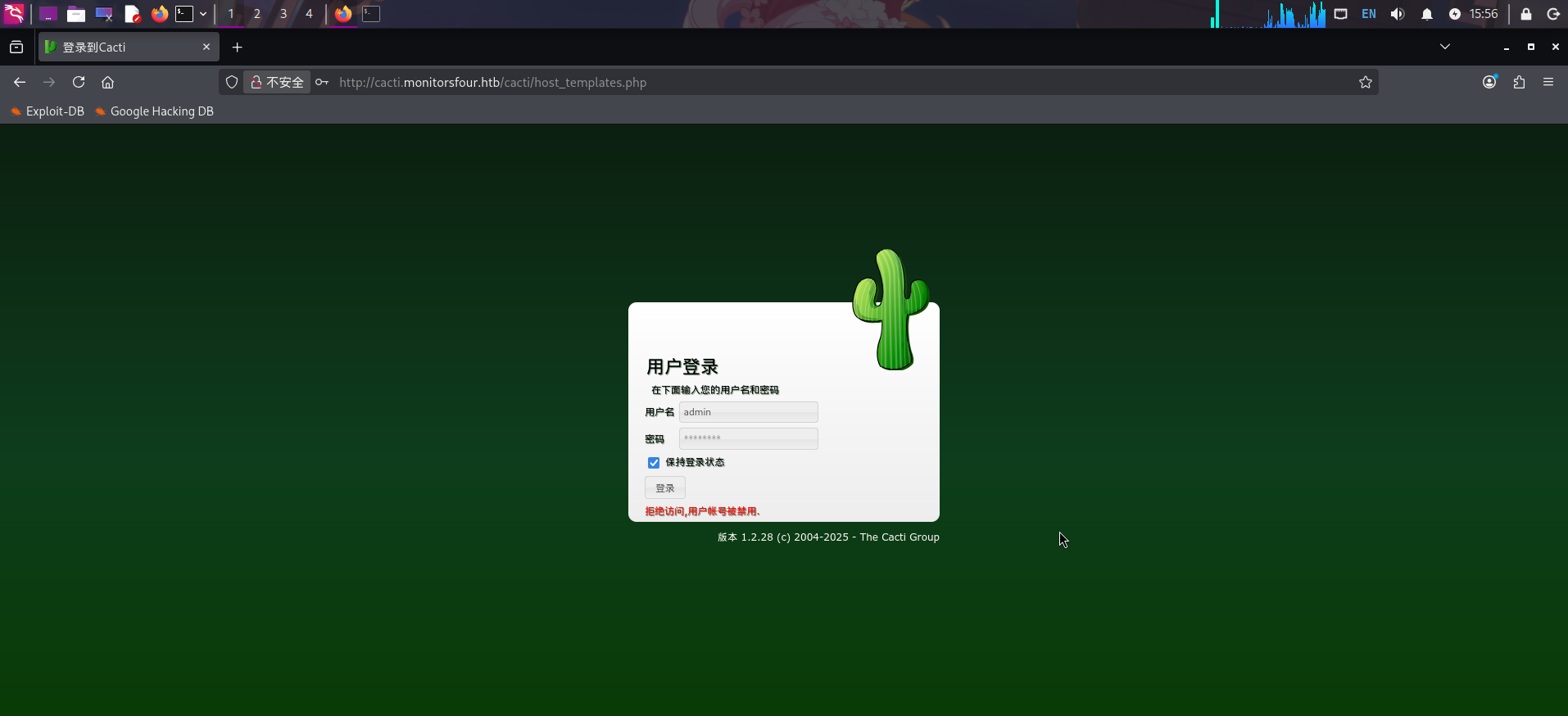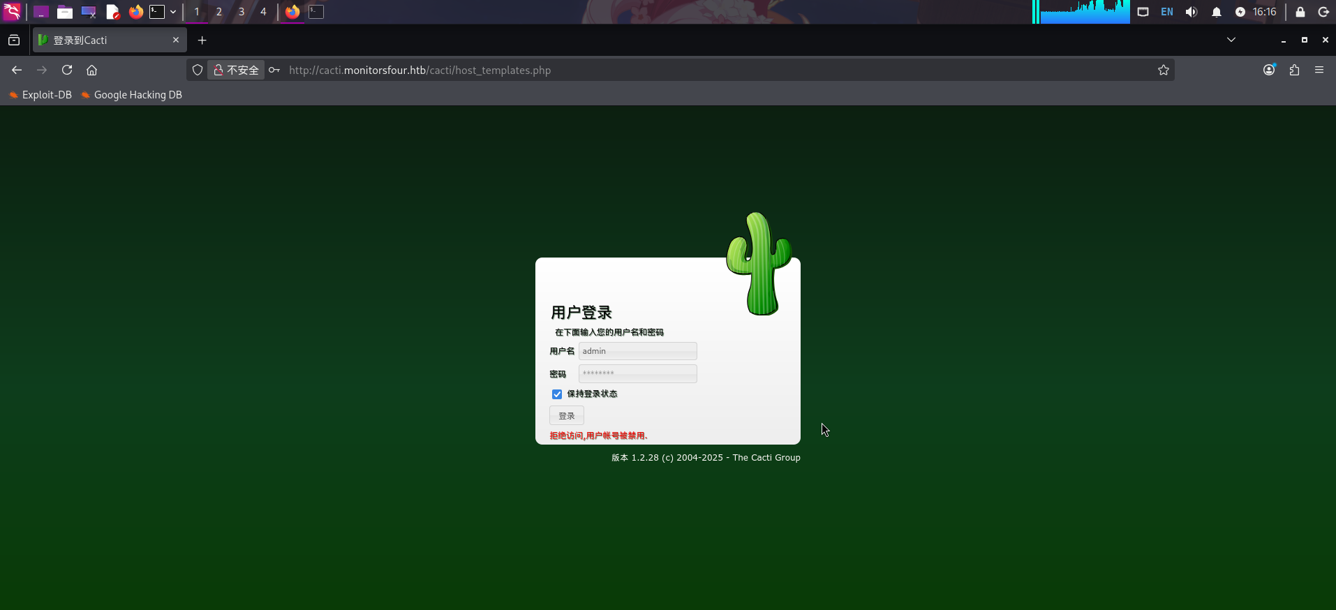 查看功能后,发现后台并无可继续利用的攻击面,遂转到子站点枚举。在Cacti登录框中输入上述凭据,发现凭据不正确: