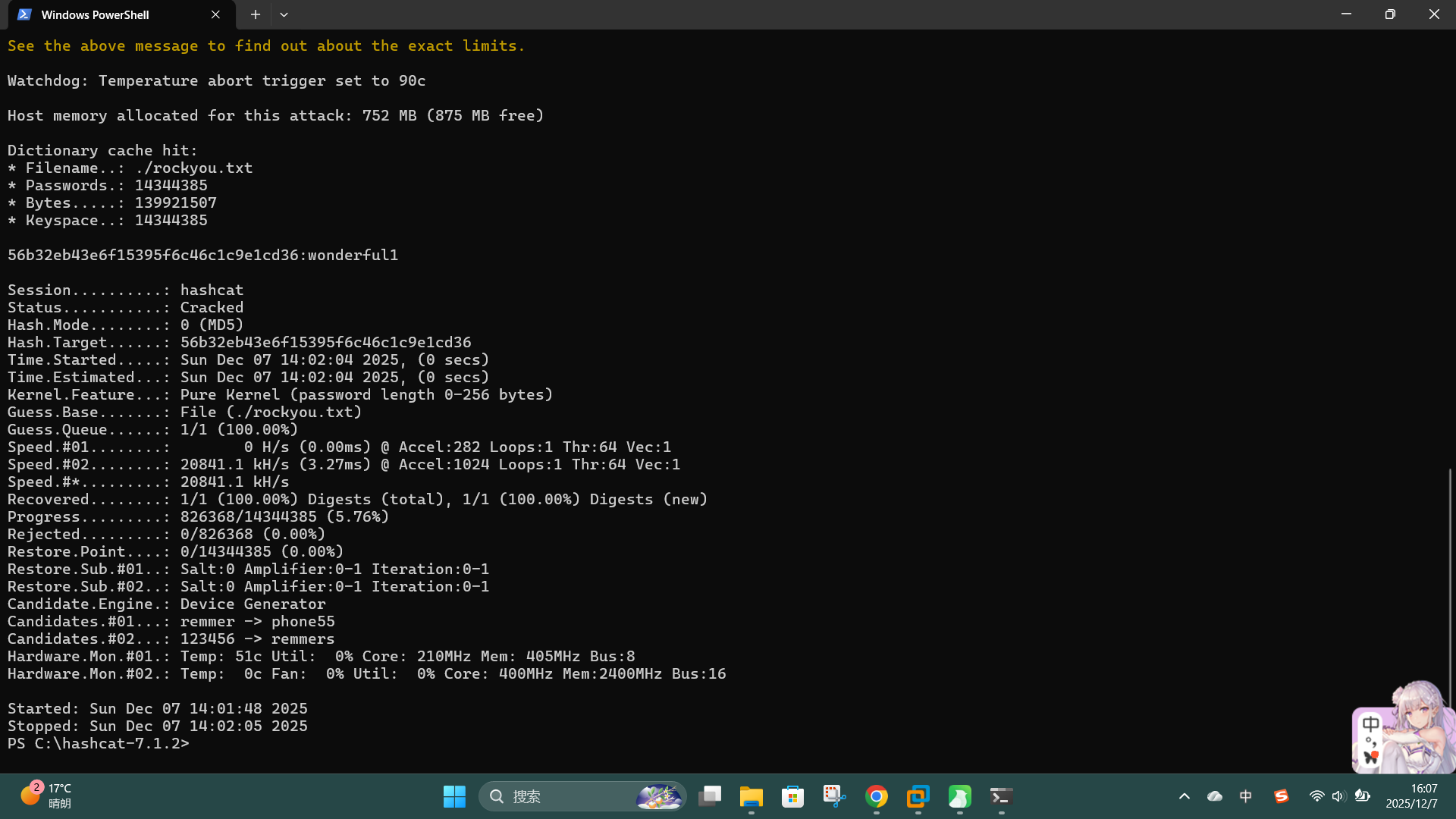 ./hashcat.exe -m 0 -a 0 "56b32eb43e6f15395f6c46c1c9e1cd36" ./rockyou.txt --force