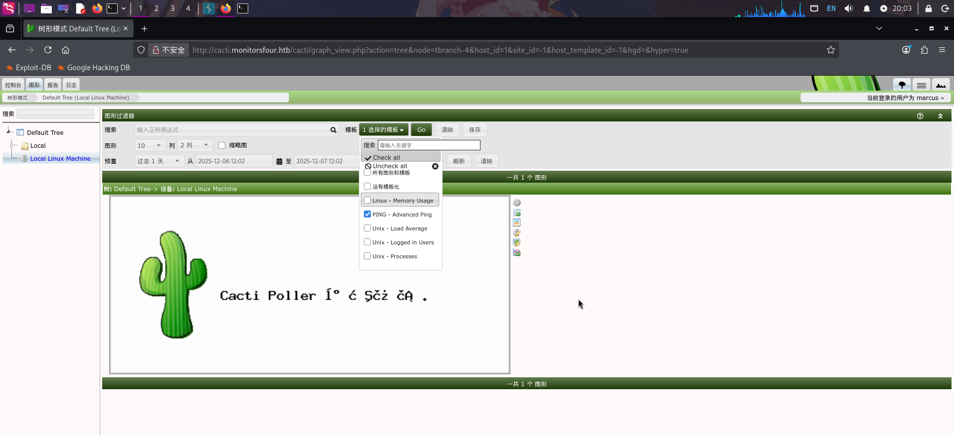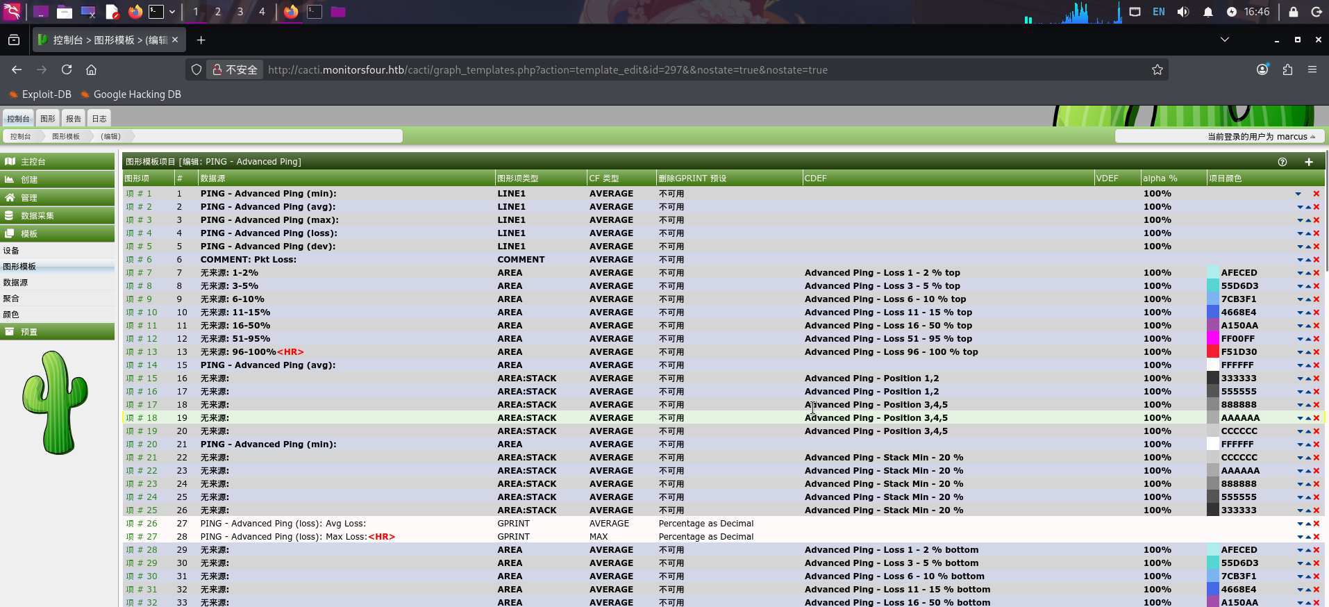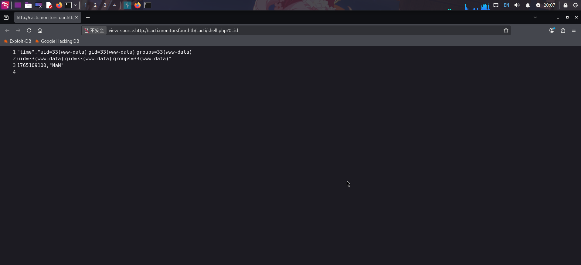 最后点击右上角的“图行数据”按钮触发恶意命令,访问http://cacti.monitorsfour.htb/cacti/shell.php: