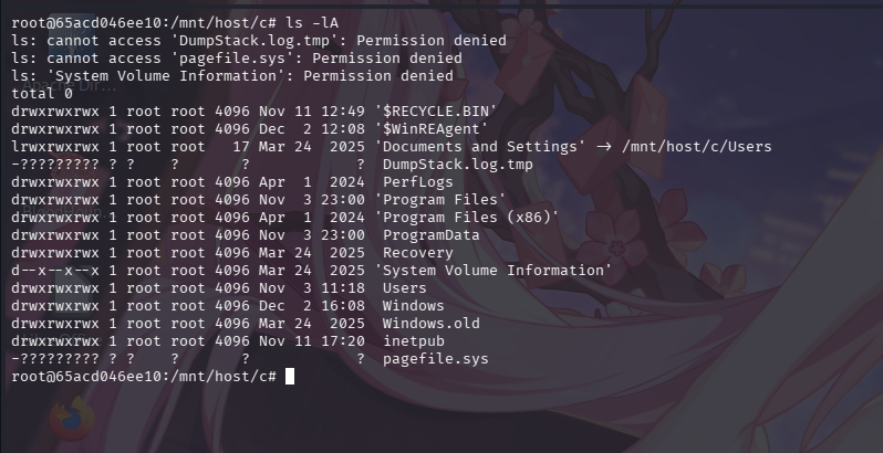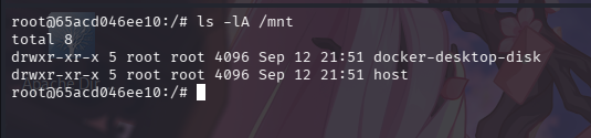 发现存在host子目录,继续查看,在/mnt/host/c/目录下,发现Docker将Windows系统根目录挂载了进来:
