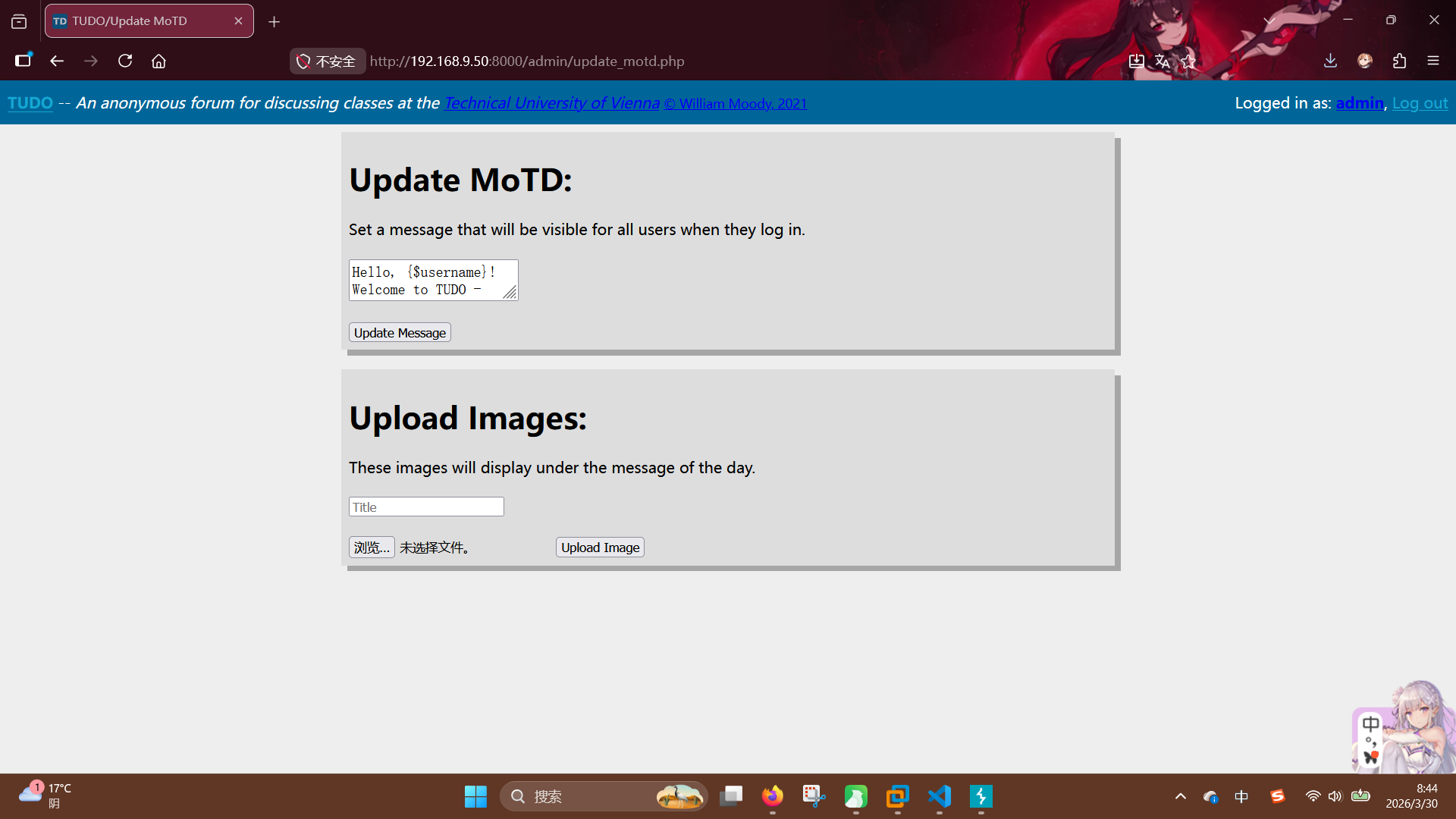 首先打开浏览器,使用题目提供的凭据登录admin用户,接着访问/admin/update_motd.php
