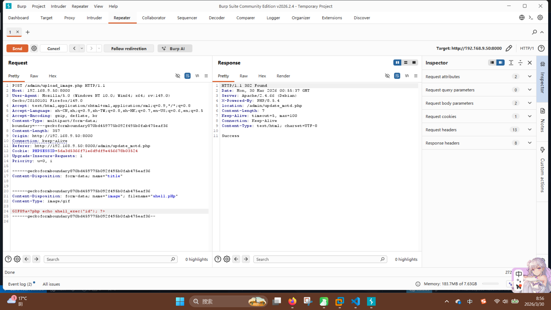 随便选择一个文件,打开BurpSuite拦截后,点击Upload Image按钮,将请求包发送到Repeater改写,尝试将上传文件名改为shell.pHp